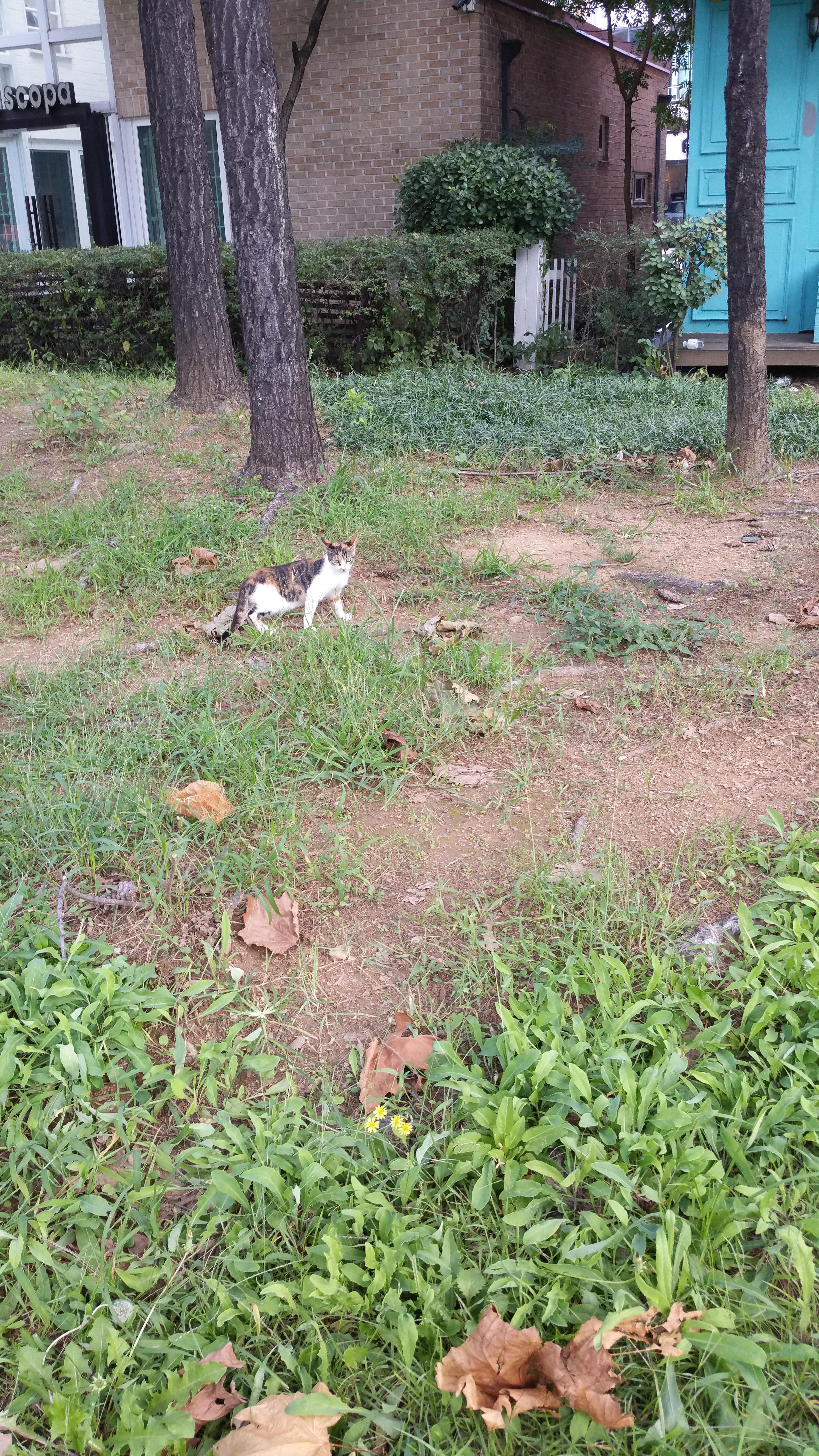 다른 날에 제가 혼자서 장 보러 갔다 오는 길에 잔디밭에서 작은 아기 고양이가 누워서 빈둥떨고 있었어요 제가 말을 걸고 사진 찍으려고 했을 때 도망가려고 했네요 고양이랑 어떻게 놀지 뭐라 가지고 참 아쉬웠어요 다음에는 우리 애들이랑 같이 더운데 구경하면서 길을 고양이를 찾아서 놀고 싶다 싶어요