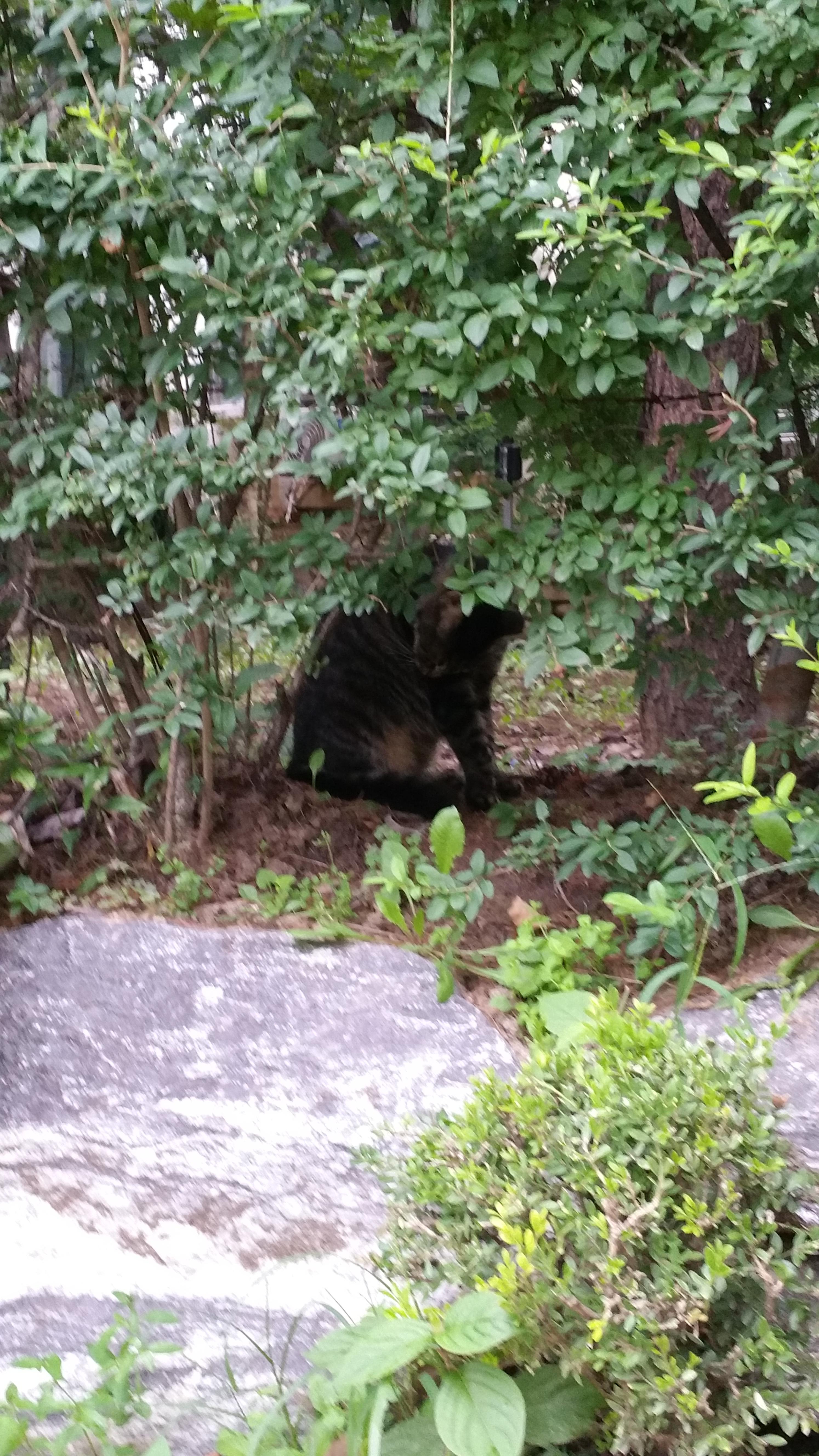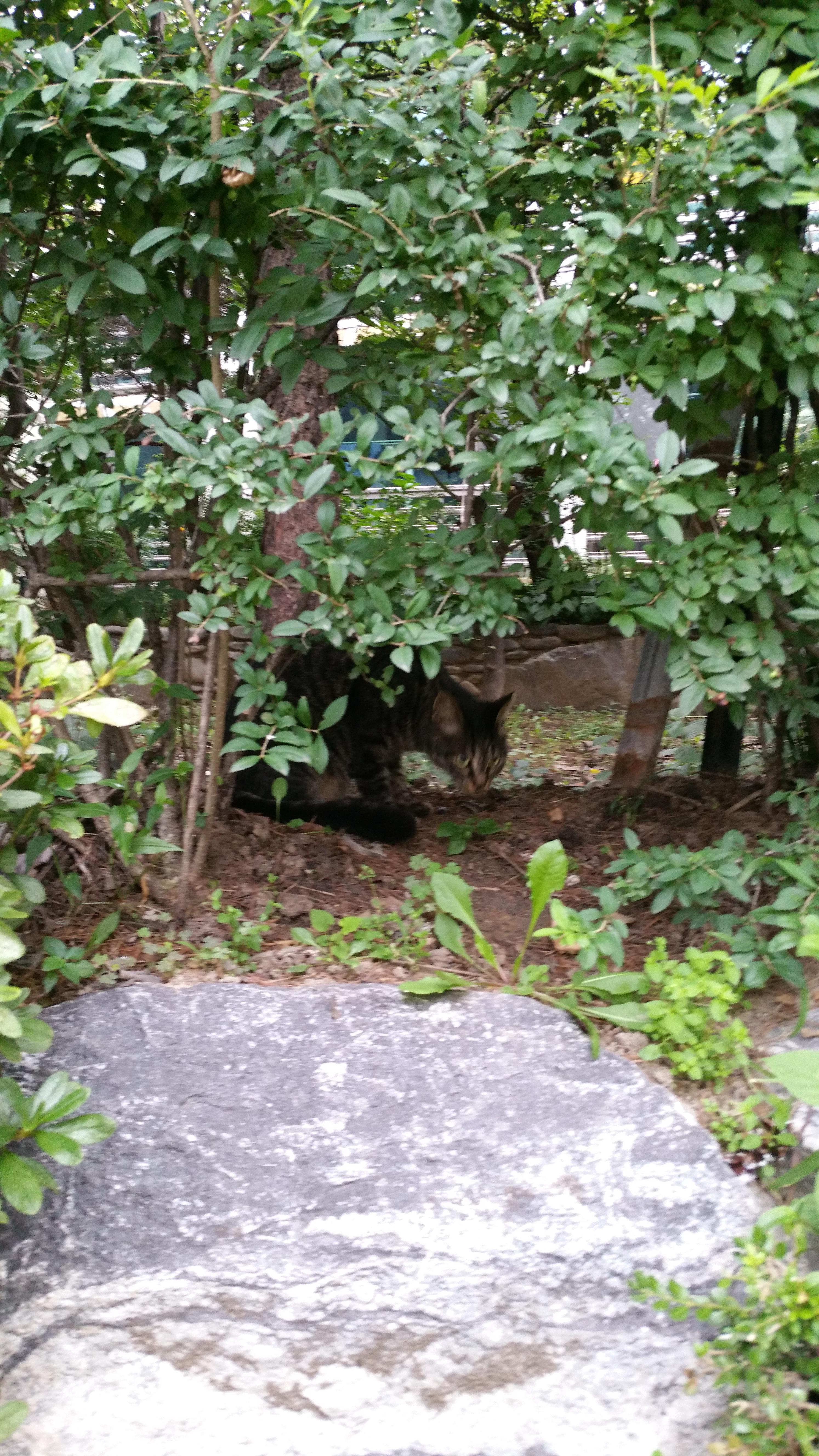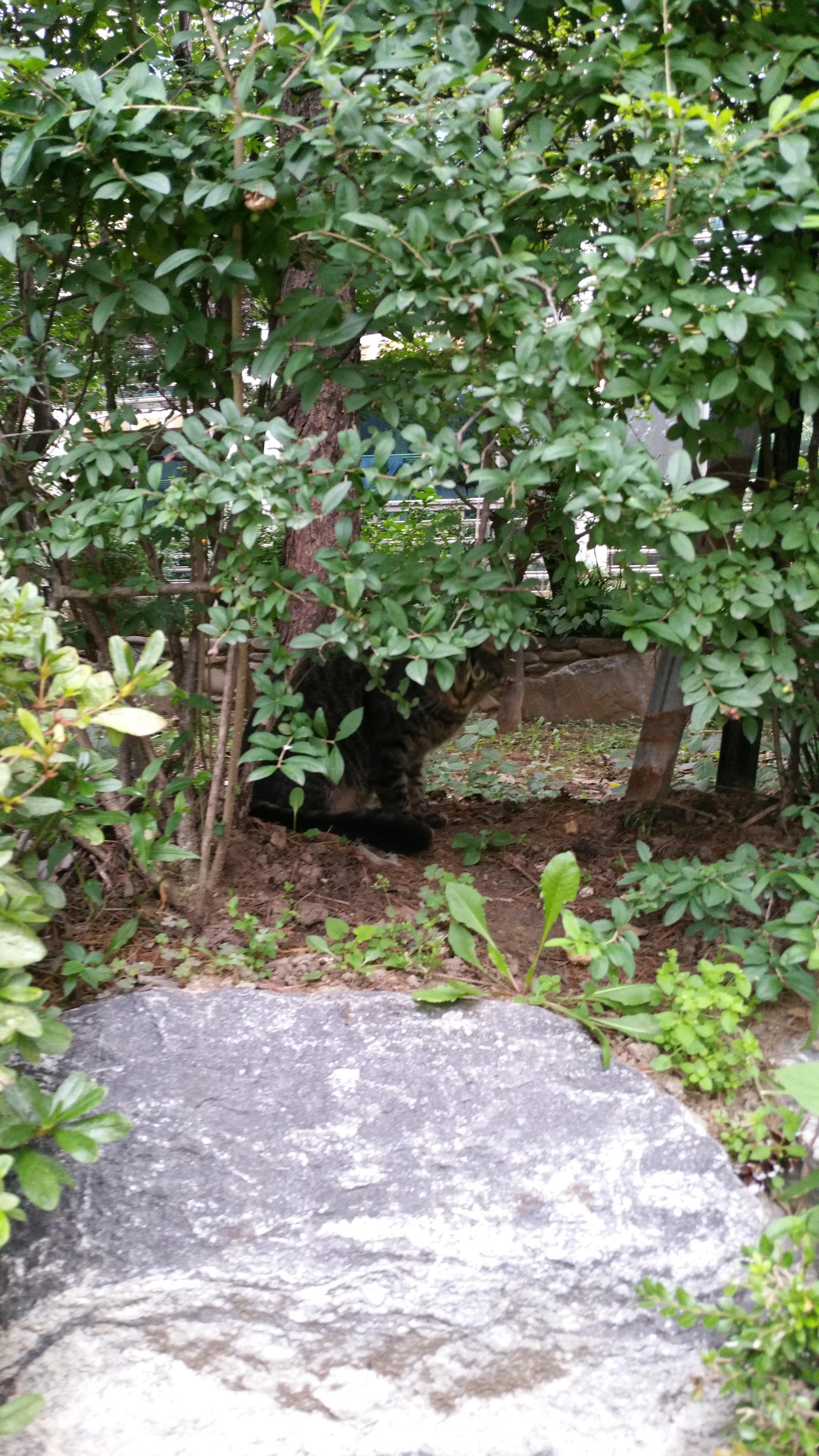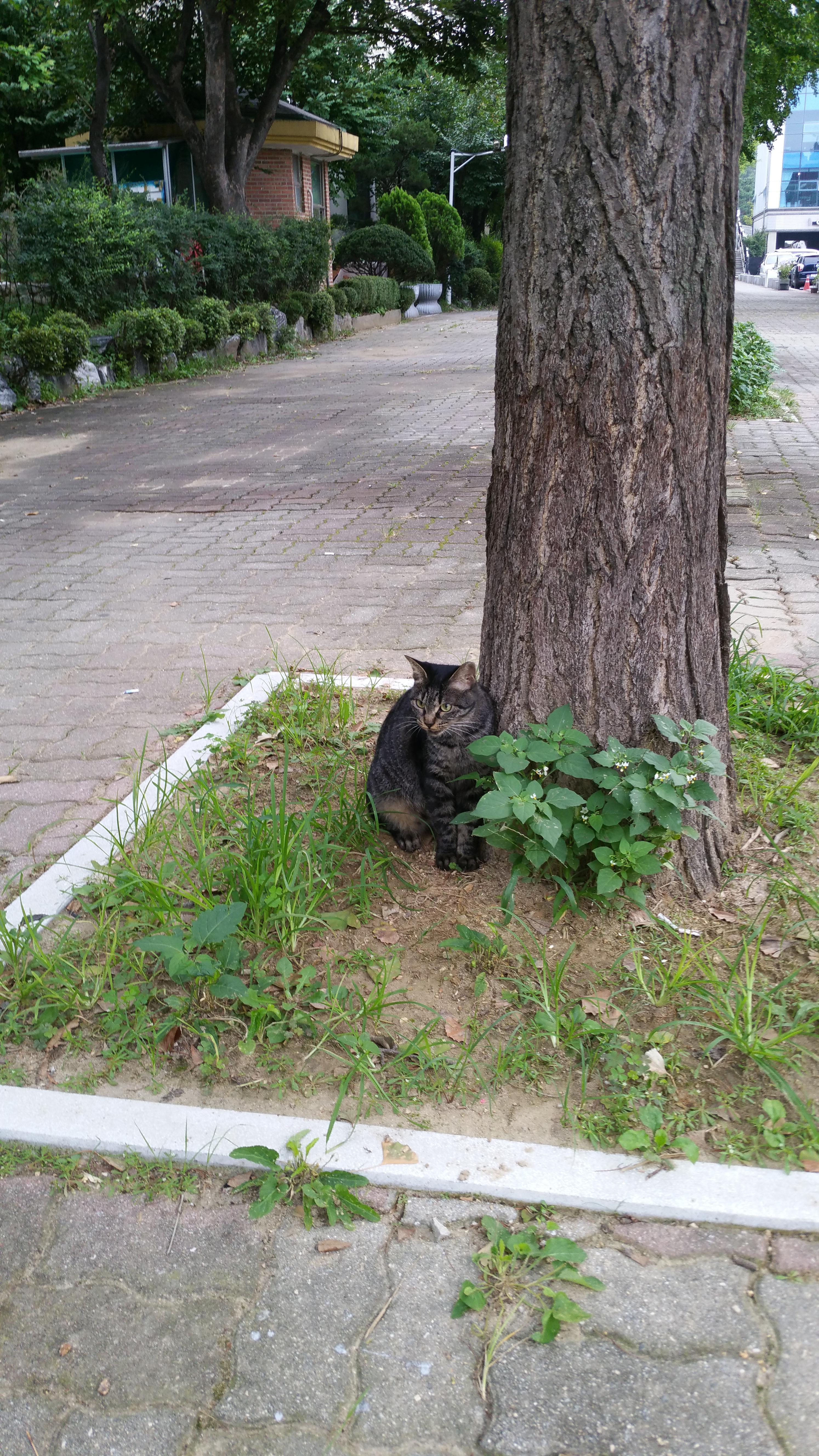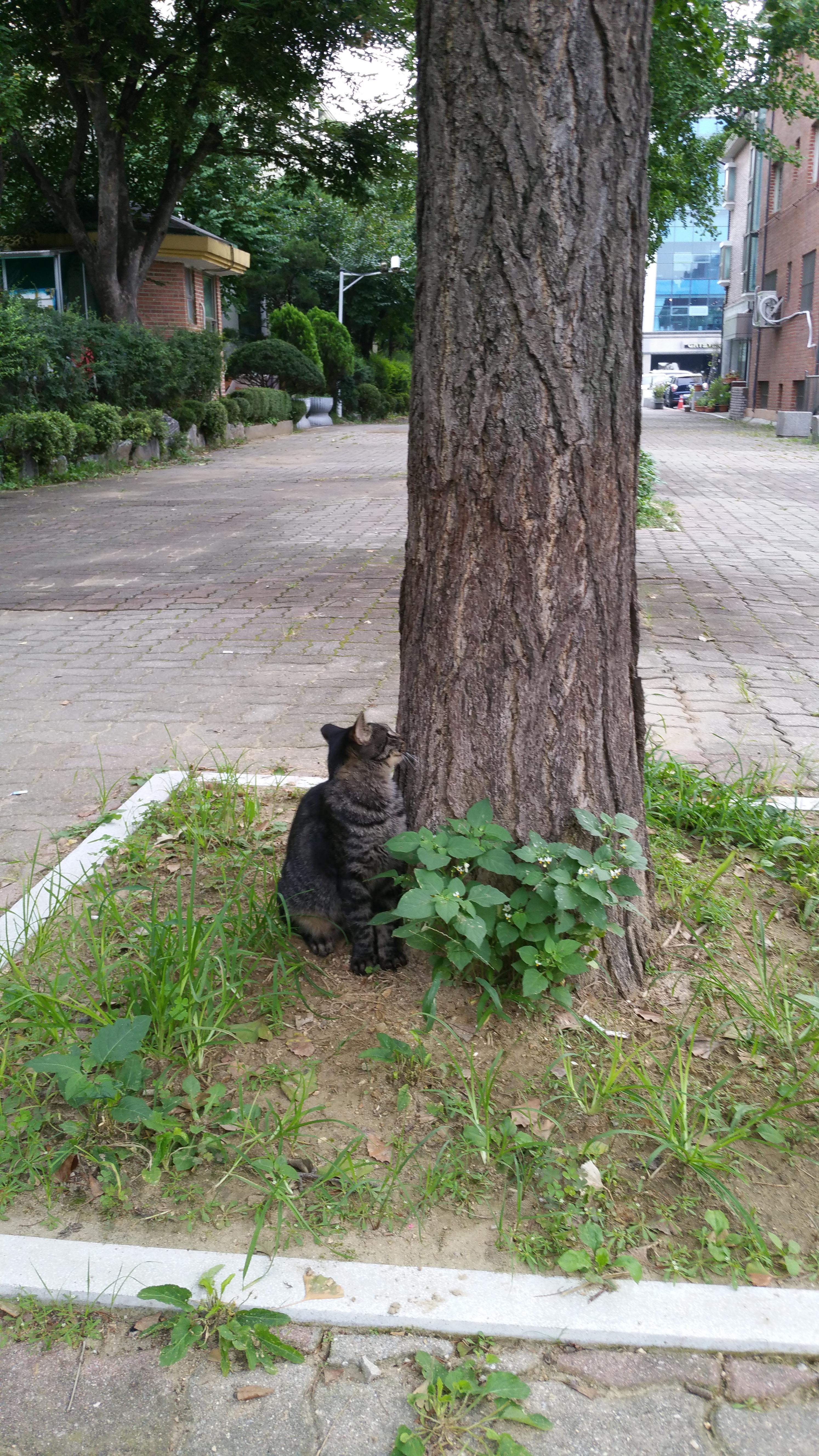 고양이하고 거리를 두고 지켜봤더니 고양이가 나와서 나무가 있는 곳에 가네요.