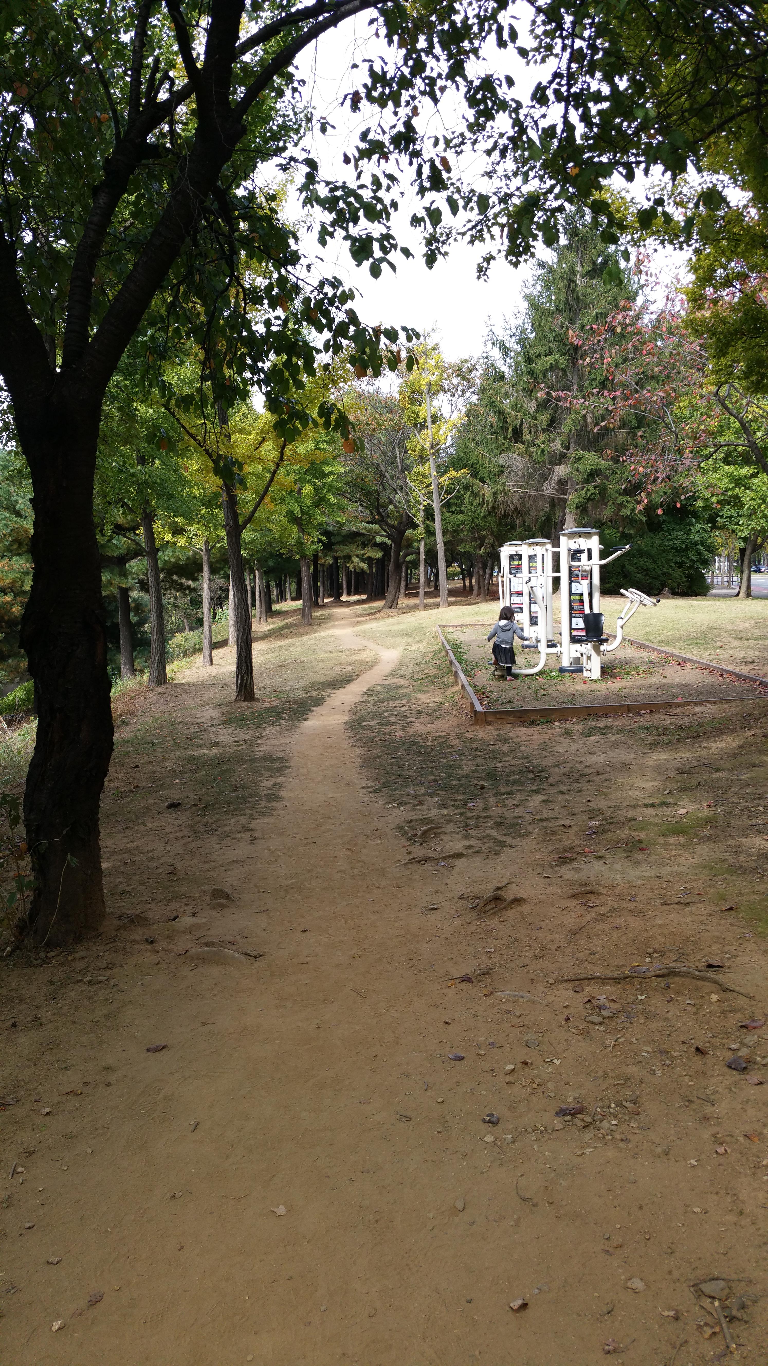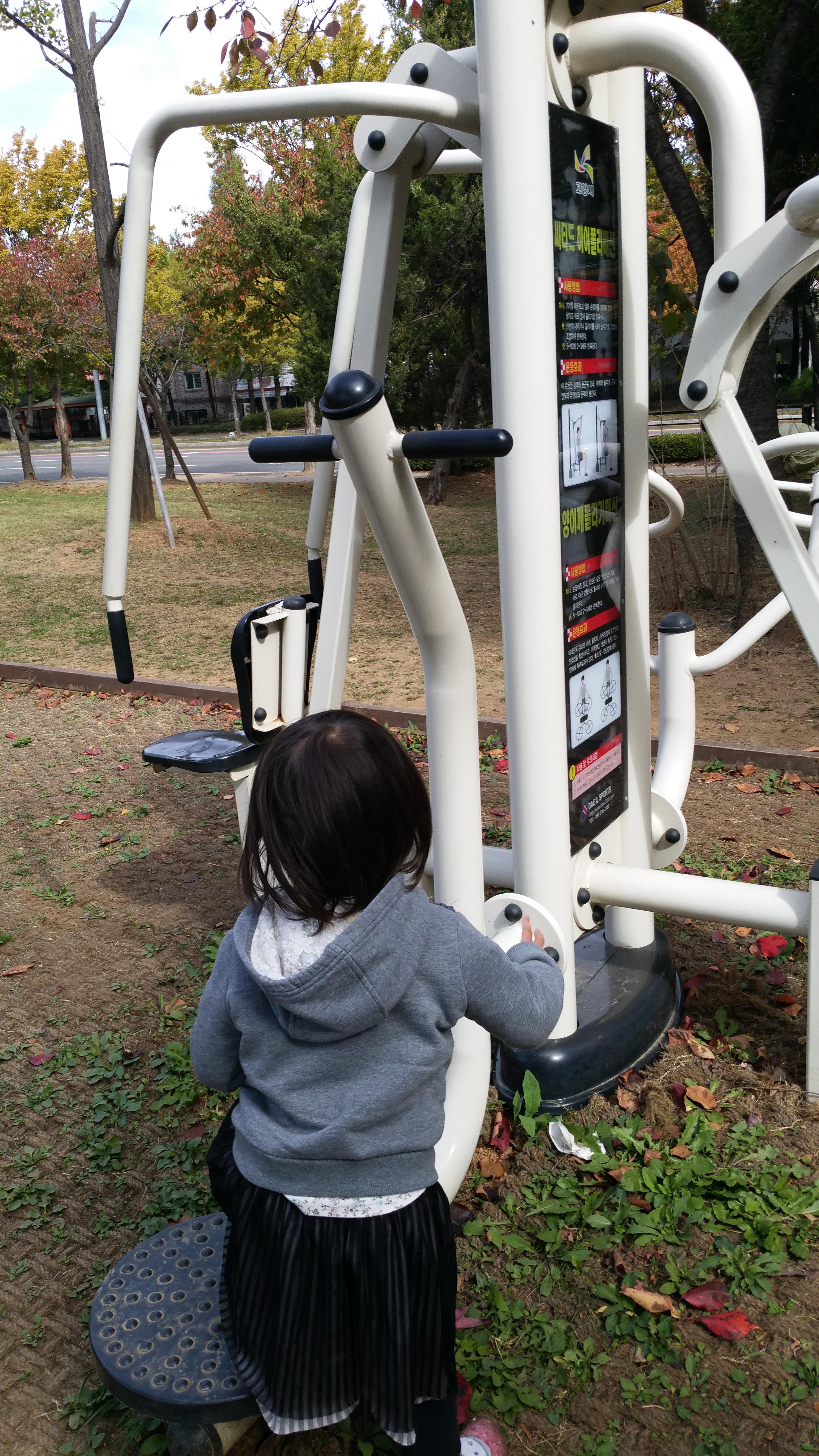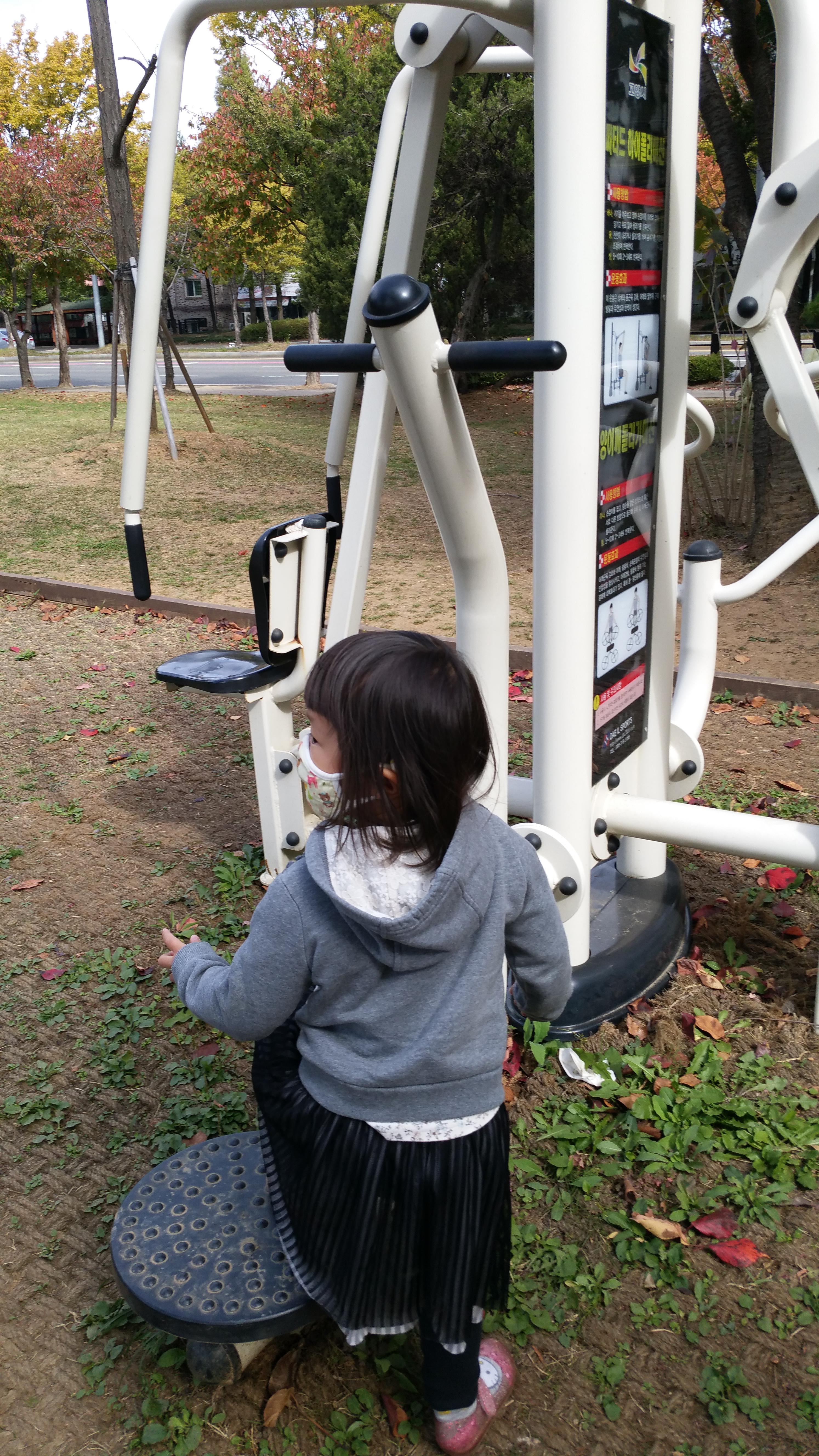 조금 걸어가고 운동기구가 있어요.딸이 신기하다고 달려가네요.운동기구가 상때가 깨끗해요.우리 동네 공원에 없는 기구도 있으니까 저도 신기했어요.